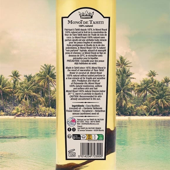 - Material: 100% Monoi de Tahiti Designation of Origin 100% natural. Without colouring. Without solar filter. Not tested on animals. A Tiare flower in this bottle. Without colouring. With a natural preservative. Coco nucifera (coconut) oil, Gardenia tahitenti